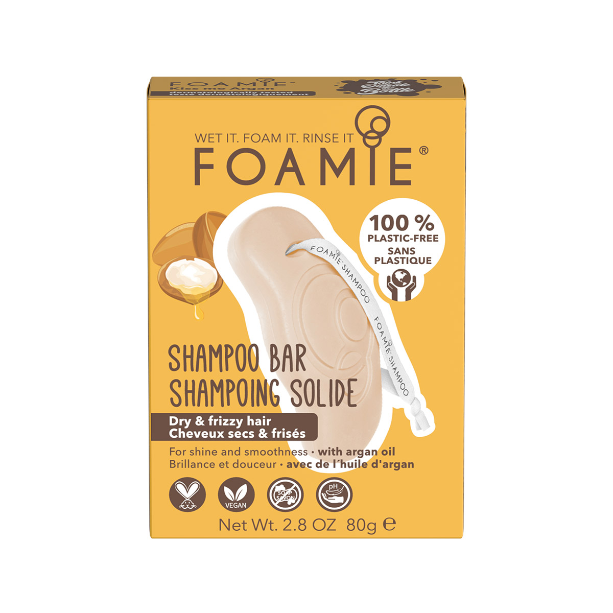 "Волосы вас не слушаются? У Foamie есть то, что вам нужно! Твердый шампунь Foamie Kiss Me Argan интенсивно питает и увлажняет сухие волосы, придает здоровый блеск и разглаживает пряди. Формула шампуня с маслами арганы и манго укрепляет корни волос, препятствует появлению секущихся кончиков, делает волосы послушными и дарит им невероятно нежный и приятный аромат. Средство удобно использовать: просто смочите его водой, чтобы получить воздушную пену!