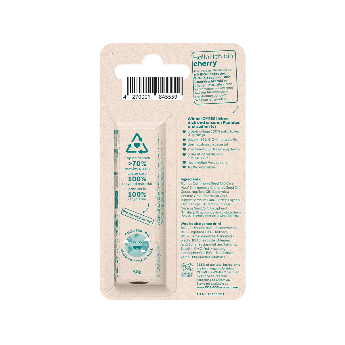 Представлен в стике 4,8 г и обладает сладким вишневым ароматом. Безопасен для планеты, не тестируется на животных, упаковка состоит из переработанного пластика и бумаги.