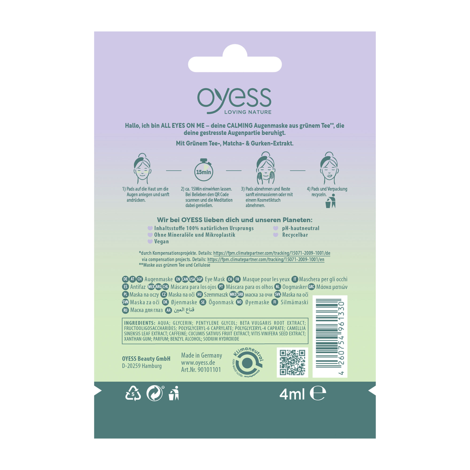 Настройтесь на позитив с успокаивающими патчами для глаз OYESS All Eyes on me Calming! В составе — экстракты матчи, зеленого чая и огурца, которые увлажняют и успокаивают чувствительную кожу. 15-минутная медитация в патчах поможет сделать освежить кожу и снять напряжение. Формула включает ухаживающие ингредиенты 100% натурального происхождения. Патчи сделаны из зеленого чая и целлюлозы.