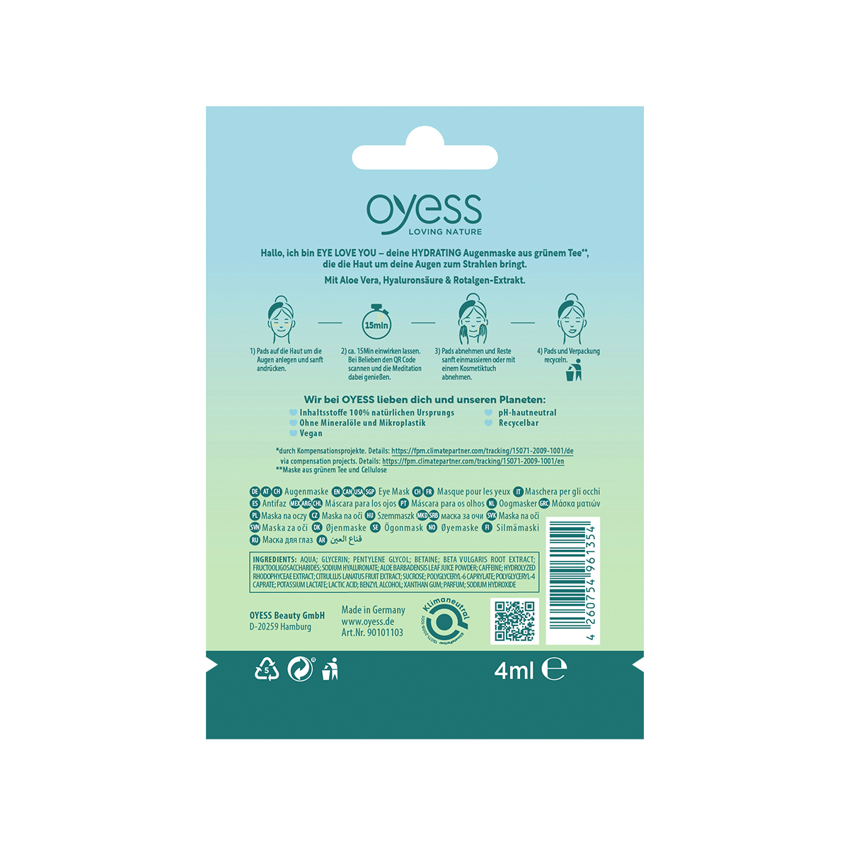 Когда вы влюблены, ваши глаза светятся от счастья! Так почему бы не влюбиться в увлажняющие патчи для глаз OYESS Eye love you Hydrating? В составе — алоэ вера, гиалуроновая кислоты и экстракт красных водорослей, которые увлажняют, успокаивают нежную кожу век и возвращают ей здоровое сияние. 15-минутная медитация в патчах поможет увлажнить кожу вокруг глаз и запустить процессы восстановления. Формула включает ухаживающие ингредиенты 100% натурального происхождения. Патчи сделаны из зеленого чая и целлюлозы.