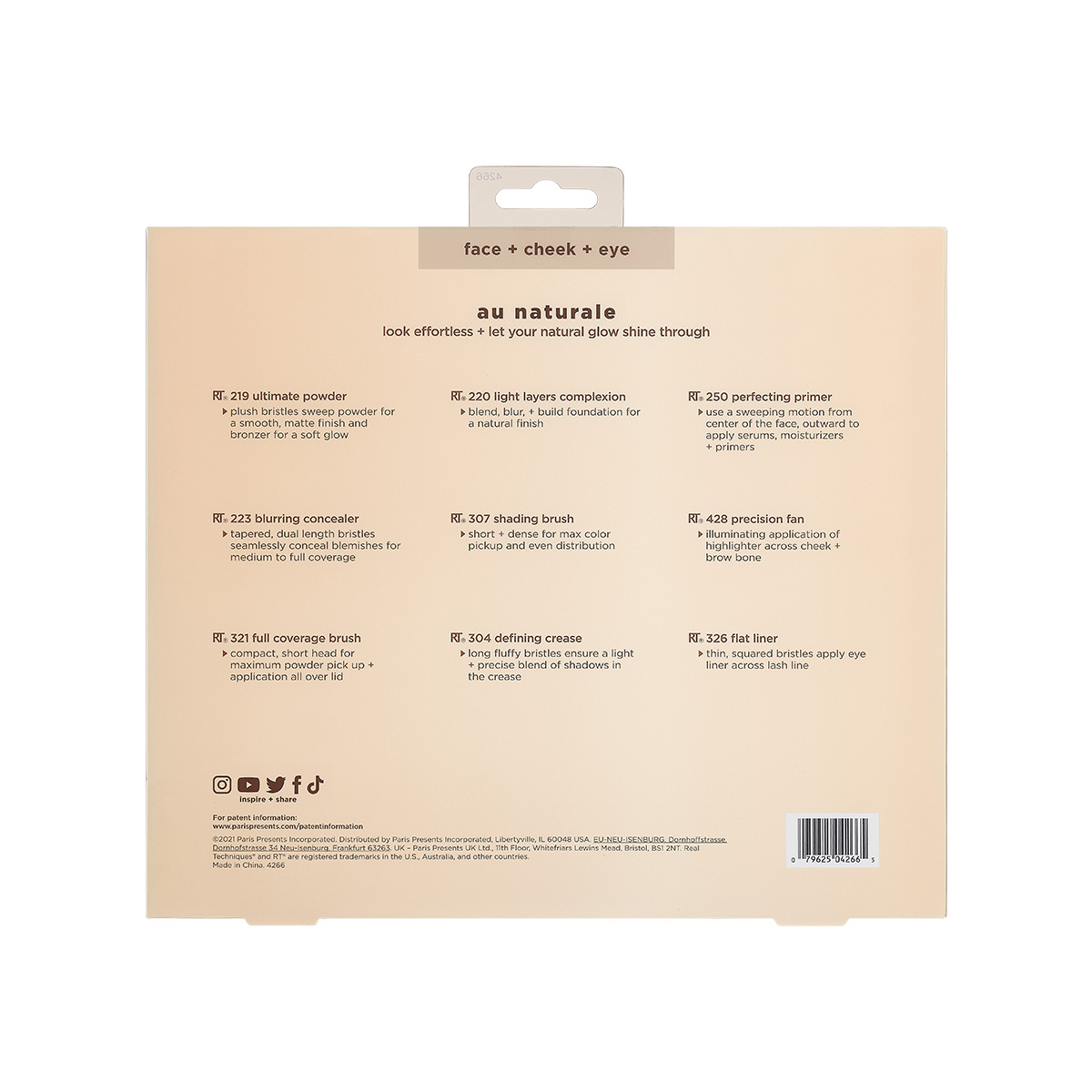 В наборе кистей Real Techniques Au Naturale Brush Kit есть все необходимые бьюти-инструменты для создания завершенного образа: от идеального тона и деликатной коррекции овала лица до изящного макияжа глаз. Внутри 9 кистей: