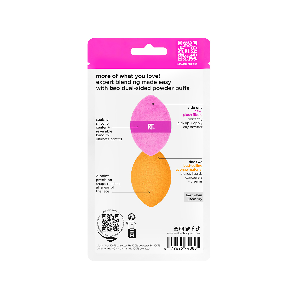 Miracle 2-in-1 Powder Puff – это двусторонняя пуховка для пудры, которая помогает создать и освежить макияж в любой ситуации. С одной стороны пуховки используется фирменный материал спонжа Real Techniques для точечной коррекции макияжа консилером и тональным кремом. С другой – новый плюшевый материал, который легко набирает нужное количество пудры, аккуратно распределяет ее по лицу, фиксируя макияж. Пуховка Miracle 2-in-1 Powder Puff выполнена в форме лепестка. Широкая сторона подходит для работы с крупными зонами лица, такими как лоб, щеки и подбородок, а узкие кончики – для коррекции области вокруг глаз и носа. Эластичная лента-держатель легко переворачивается на нужную сторону. Подходит для использования с сухими, жидкими и кремовыми продуктами.