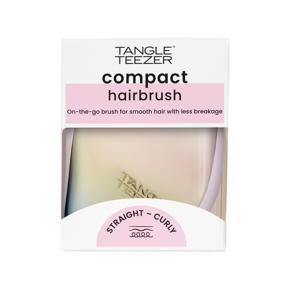 Расческа Tangle Teezer Compact Styler Rainbow Pearlescent Matte – компактная версия знаменитой расчески Tangle Teezer, которая поможет поправить прическу в любой ситуации! Гибкие двухуровневые зубчики бережно распутывают волосы, не повреждая их. Благодаря компактной форме расческа поместится даже в небольшую сумочку, а плотно прилегающая крышка защитит зубчики от пыли и повреждений. Результат применения – гладкие и блестящие волосы. Расческа Compact Styler Rainbow Ombre Chrome представлена в переливающихся тонах, напоминающих радугу, и имеет матовое покрытие. Подходит для всех типов волос. Не используйте с феном.